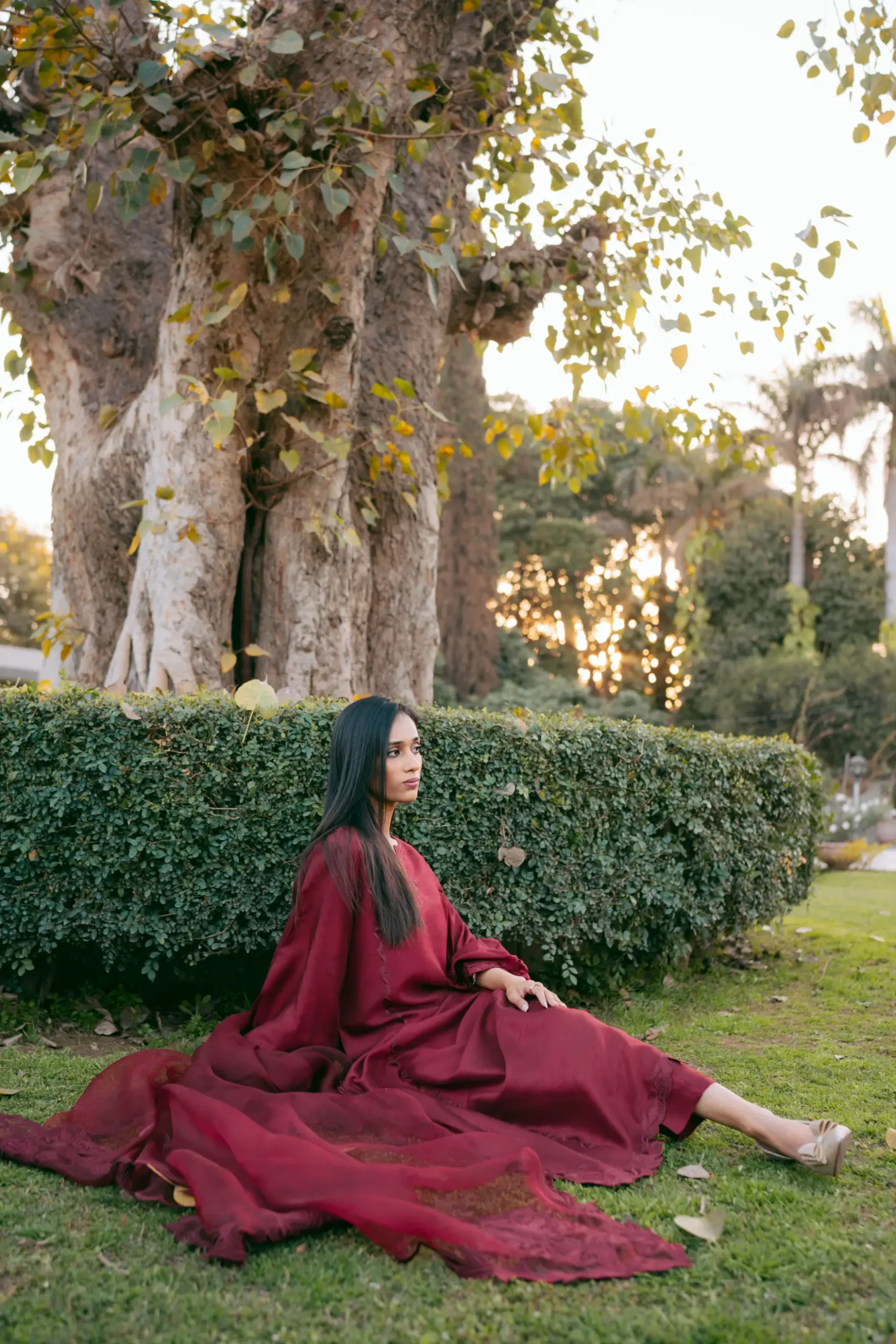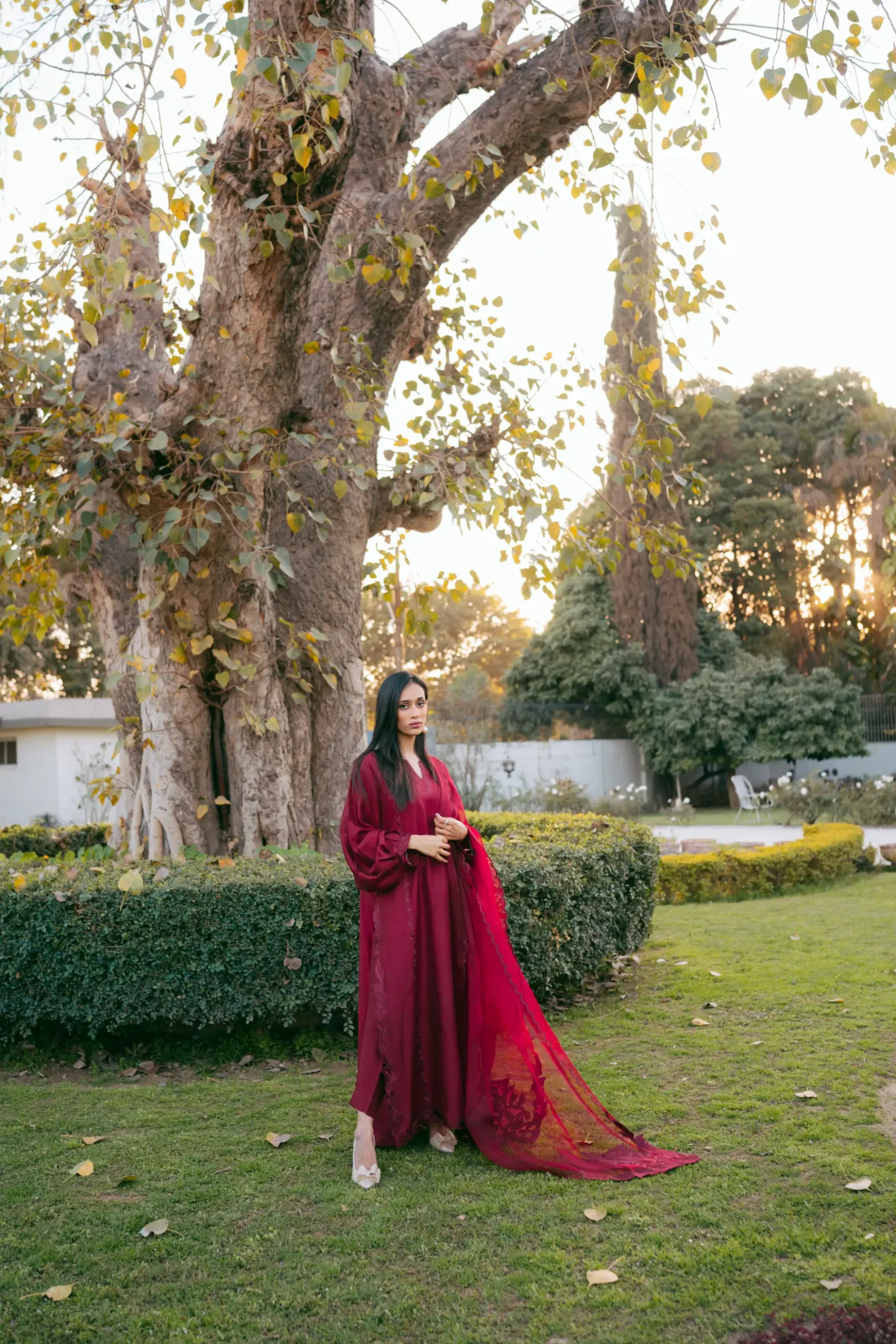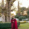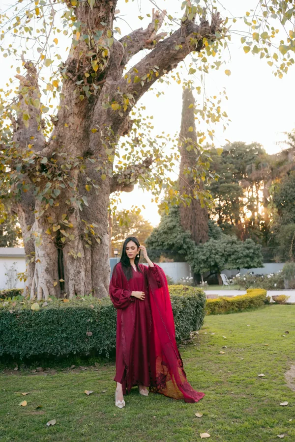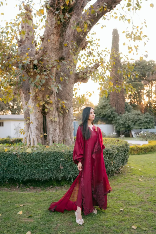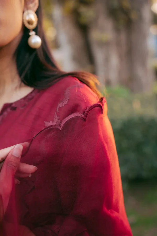 A monotone ruby raw silk silhouette adorned with cutwork and embroidery.
