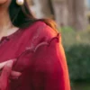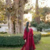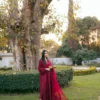 The raw silk dress is paired with a pure organza dupatta which is also detailed with ruby red embroidery and cutwork on its four sides.